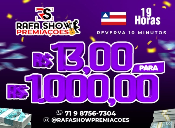 R$ 13,00 PRA R$ 1.000,00 05/03 19Hrs. RESERVA 10 MINUTOS